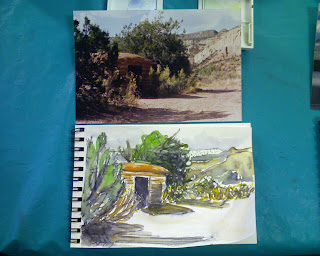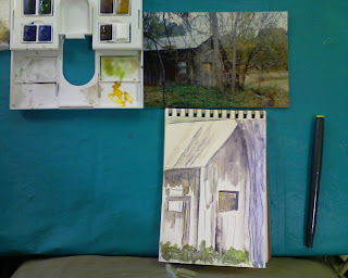 Here’s the progression of work in my Pocket Sketching class–a three day course in how to train yourself to do 25 minutes or less sketches of one’s surroundings. Not unhappy with the first day’s progress at all.